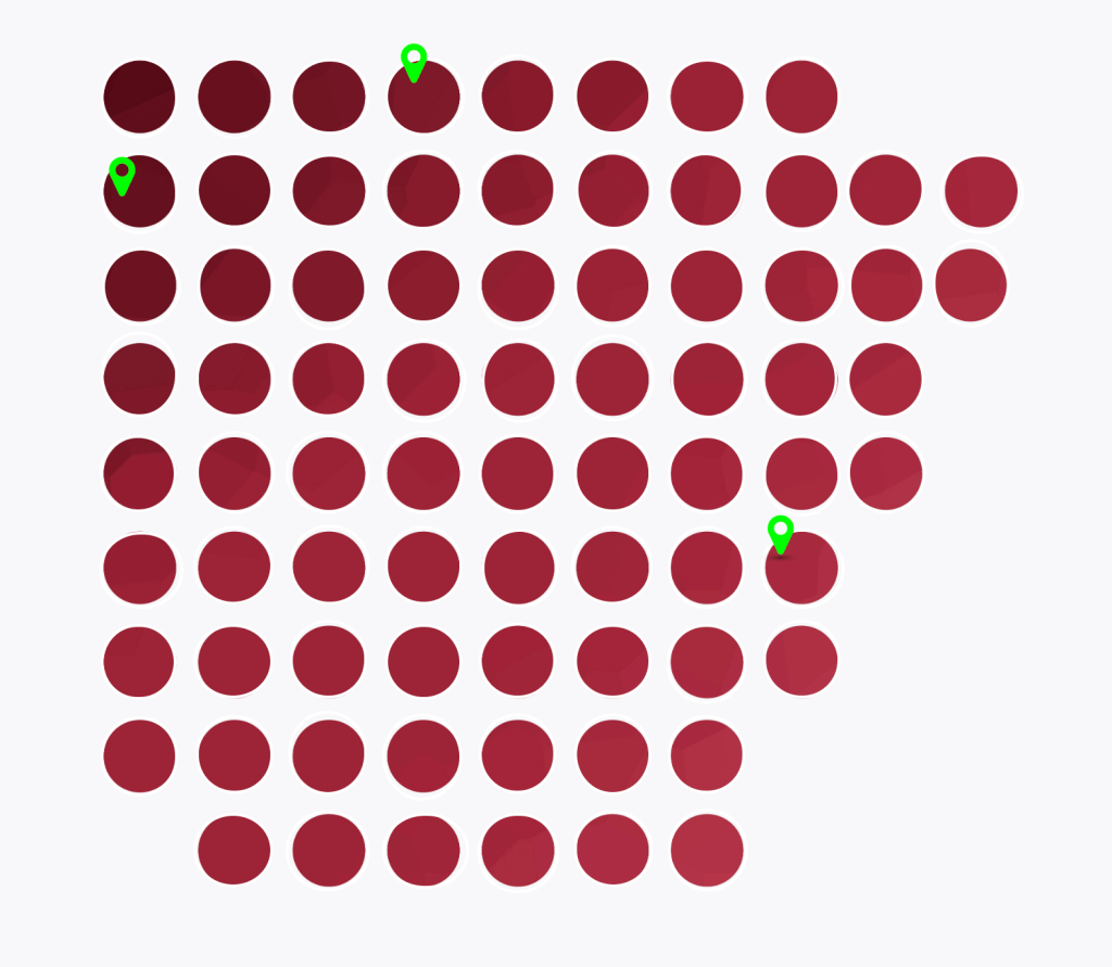 The design consists of 75 identical circles representing each county in Arkansas. The green marker highlights the location of each student and project.